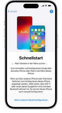 Schalten Sie Ihr neues iPhone ein und legen Sie es neben Ihr Android-Gerät. Folgen Sie den Anweisungen auf dem Bildschirm, um mit der Ersteinrichtung zu beginnen. Wenn Sie den Bildschirm Schnellstart erreichen, wählen Sie Ohne ein anderes Apple-Gerät einrichten und folgen Sie den angezeigten Schritten. In einigen Fällen werden Sie möglicherweise aufgefordert, eine eSIM-Karte zu aktivieren.